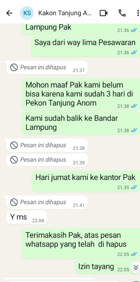 Tanggamus, Orasipubliknews.co.id – Dugaan korupsi dana desa di Pekon Tanjung Anom, Kabupaten Tanggamus, semakin berkembang dengan arah yang makin mencurigakan. Pasca dimintai hak jawab, Kepala Desa (Kakon) Tanjung Anom, Sumardi, justru diduga melakukan penghapusan bukti percakapan WhatsApp (WA) yang digunakan selama proses klarifikasi dengan redaksi. Tindakan ini dinilai sebagai upaya sistematis untuk mengaburkan jejak dan mengganggu investigasi.