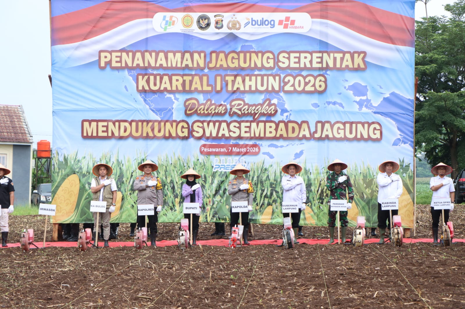 PESAWARAN, Orasipubliknews.co.id – Dalam upaya mendukung program strategis pemerintah mewujudkan Swasembada Jagung Nasional Tahun 2026, jajaran Polda Lampung bersama Polres Pesawaran mengikuti kegiatan Penanaman Jagung Serentak Kuartal I yang dipimpin langsung oleh Kapolri Jenderal Polisi Drs. Listyo Sigit Prabowo, M.Si., dari Kabupaten Ogan Ilir, Provinsi Sumatera Selatan, Sabtu (7/3/2026) sore.