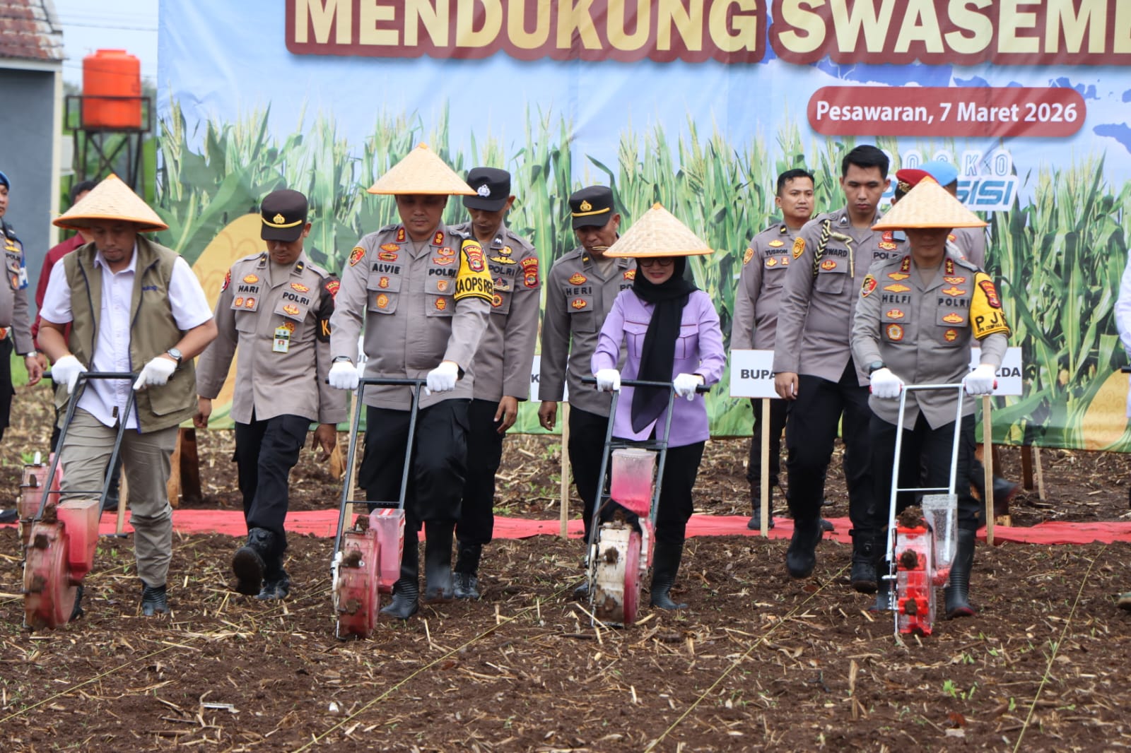 PESAWARAN, Orasipubliknews.co.id – Dalam upaya mendukung program strategis pemerintah mewujudkan Swasembada Jagung Nasional Tahun 2026, jajaran Polda Lampung bersama Polres Pesawaran mengikuti kegiatan Penanaman Jagung Serentak Kuartal I yang dipimpin langsung oleh Kapolri Jenderal Polisi Drs. Listyo Sigit Prabowo, M.Si., dari Kabupaten Ogan Ilir, Provinsi Sumatera Selatan, Sabtu (7/3/2026) sore.