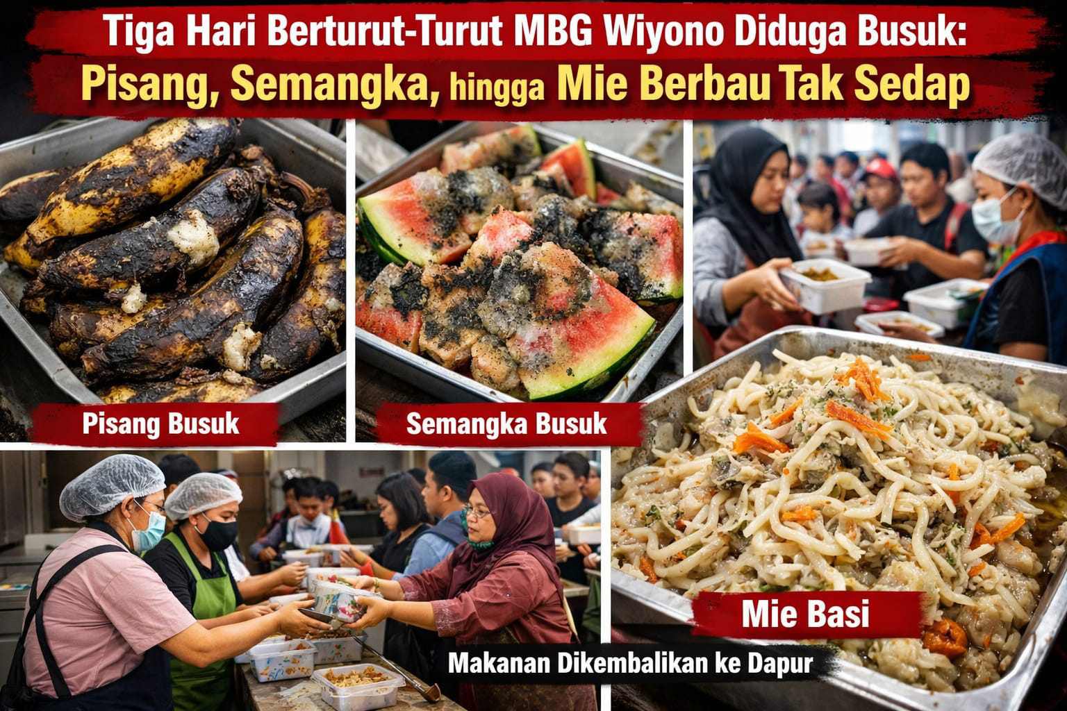 Pesawaran, Lampung – Program Makan Bergizi Gratis (MBG) yang seharusnya menyehatkan generasi bangsa, justru berubah menjadi mimpi buruk bagi puluhan wali murid di Desa Kebagusan, Kecamatan Gedong Tataan, Kabupaten Pesawaran. Dalam tiga hari beruntun, menu yang disajikan Satuan Pelayanan Pemenuhan Gizi (SPPG) Dapur Wiyono disebut-sebut sudah tidak layak konsumsi—mulai dari buah busuk hingga sayur mie yang mengeluarkan bau basi.