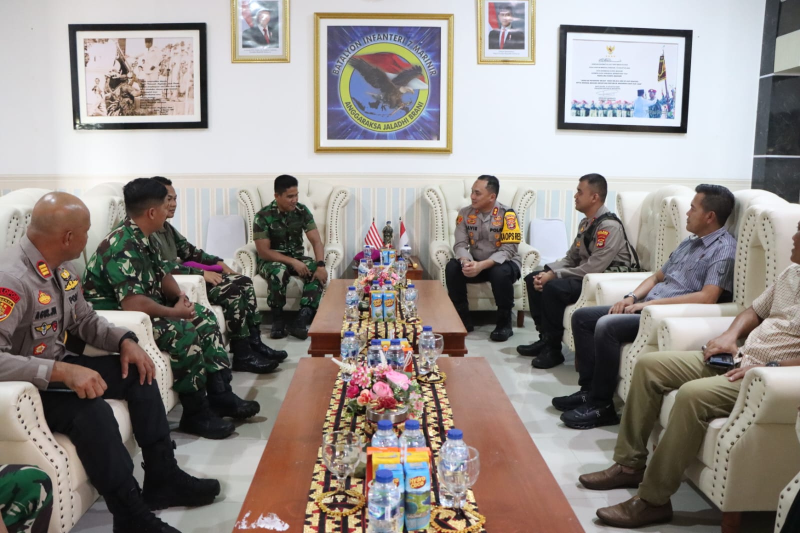 Silaturahmi kemudian berlanjut ke Markas Komando Batalyon 7 Marinir/BS. Kapolres beserta jajaran disambut langsung oleh Komandan Batalyon 7 Marinir/BS Letkol (Mar) M. Kristian Widiantoro, M.Tr.Opsla, bersama pejabat utama. Dialog strategis yang terjalin membahas penguatan langkah preventif dan responsif guna mengantisipasi potensi gangguan kamtibmas, termasuk pengamanan jalur laut dan wilayah pesisir.