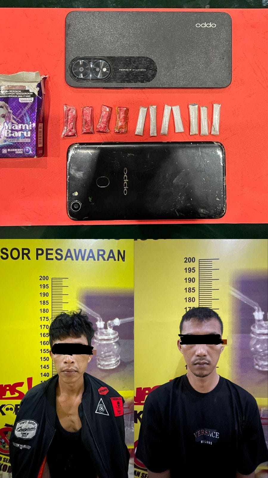 Kedua pelaku masing-masing berinisial J.P.S. (31), warga Kota Bandar Lampung, dan M.S. (30), warga Desa Wiyono, Gedong Tataan. Dari tangan mereka, petugas menyita sejumlah barang bukti, antara lain 11 bungkus plastik klip berisi sabu dengan total berat bruto 3,01 gram, satu kotak rokok merek Mami Baru, dua unit handphone Oppo warna hitam, serta satu unit sepeda motor Suzuki FU.