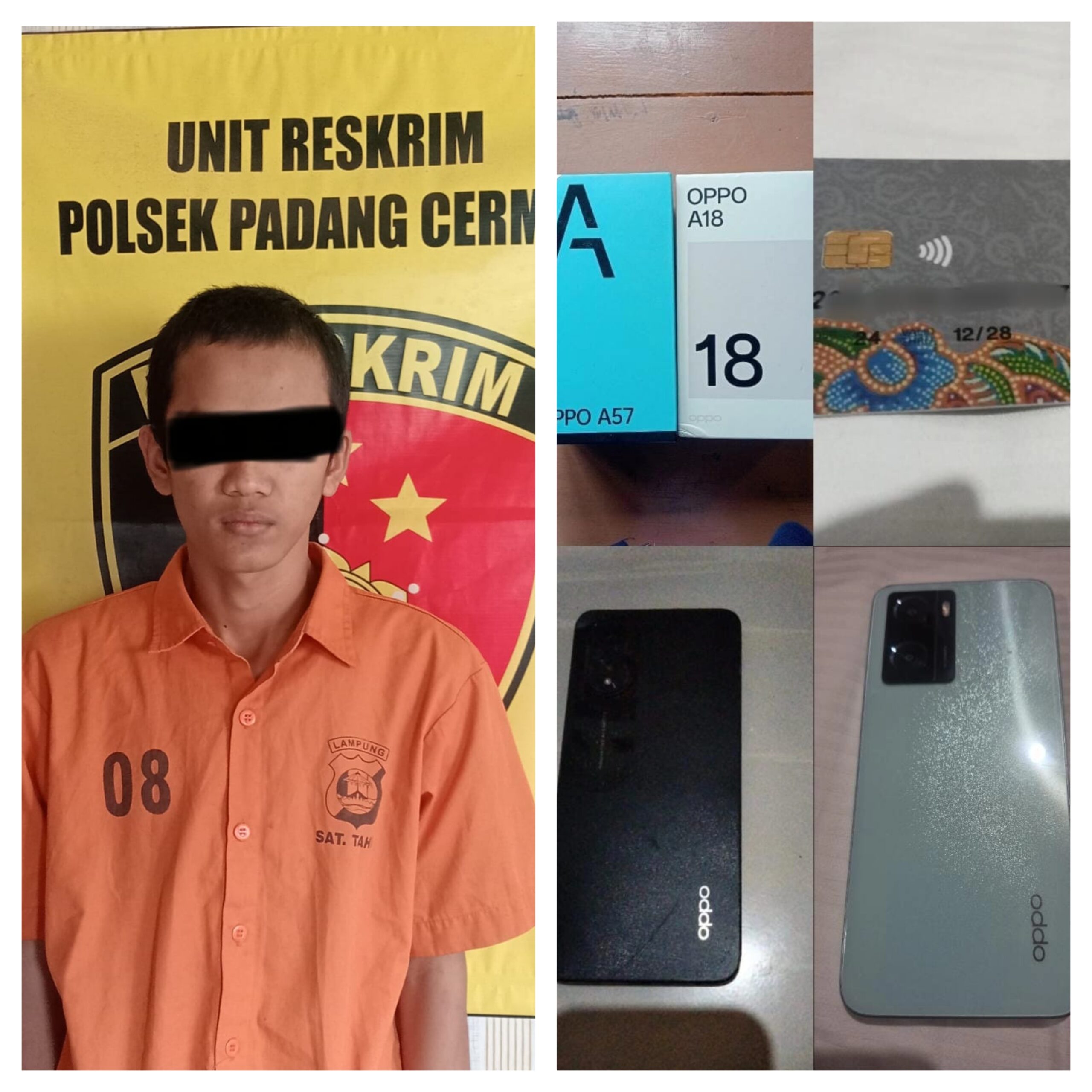 Tanpa membuang waktu, Tim Tekab 308 Presisi langsung melakukan penangkapan di wilayah Desa Tanjung Agung. Pelaku diamankan beserta barang bukti yang berhasil disita, yaitu dua unit handphone merek OPPO dan satu kartu ATM milik korban.